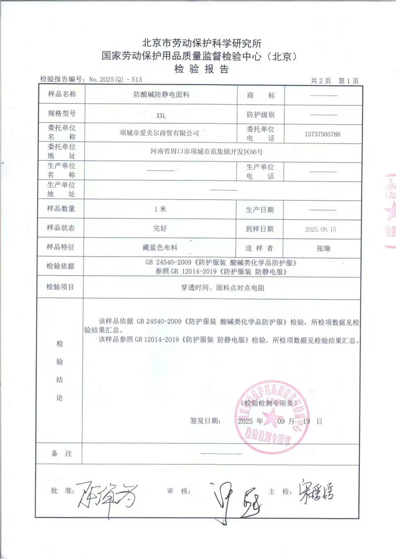 1、合体防静电防护服执行GB 12014-2019《防护服装 防静电服》标准。面料外观无破损、斑点、污物等影响性能的缺陷。其理化性能方面,甲醛含量、pH值、可分解致癌芳香胺染料、异味等符合国家纺织品安全标准;透气率、色牢度、断裂强度、撕破强力等达到相应要求;点对点电阻满足特定范围,确保静电能及时消散。